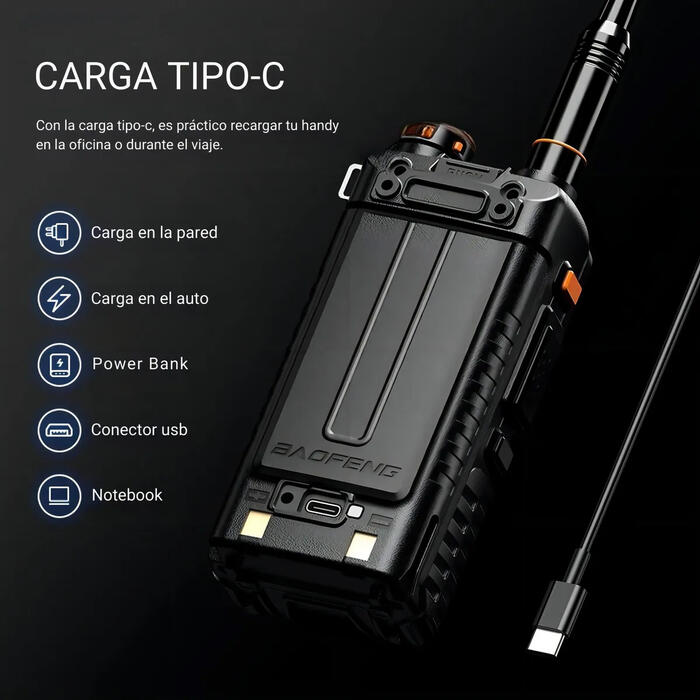 El Baofeng UV-5RH es una radio de alta potencia (10W) con doble banda (VHF/UHF) y una pantalla a color. Este modelo avanzado incluye características como carga por USB-C, 999 canales de memoria, una linterna integrada y funciones de búsqueda de frecuencia rápida. Es un equipo robusto diseñado para comunicaciones de largo alcance en actividades al aire libre, emergencias y operaciones de seguridad.